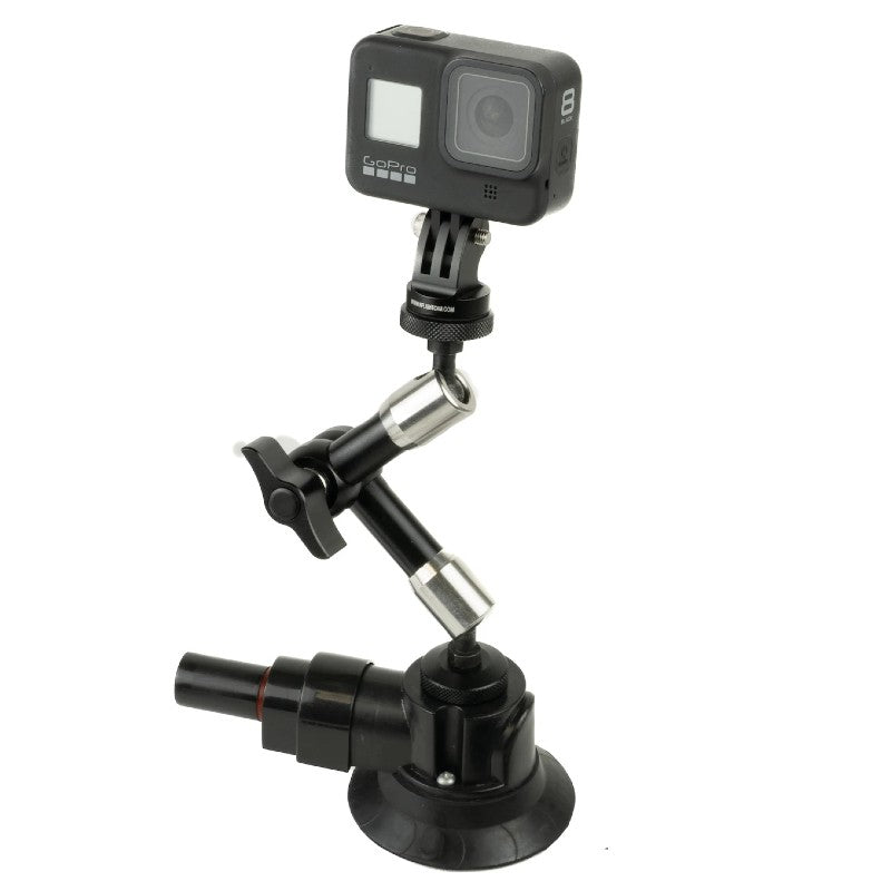 The vacuum suction cup has industrial-strength holding power, and the fully-articulating stainless steel arm allows complete freedom to aim the camera in any direction. This suction cup and stainless steel arm combo is designed and tested for use inside the aircraft.