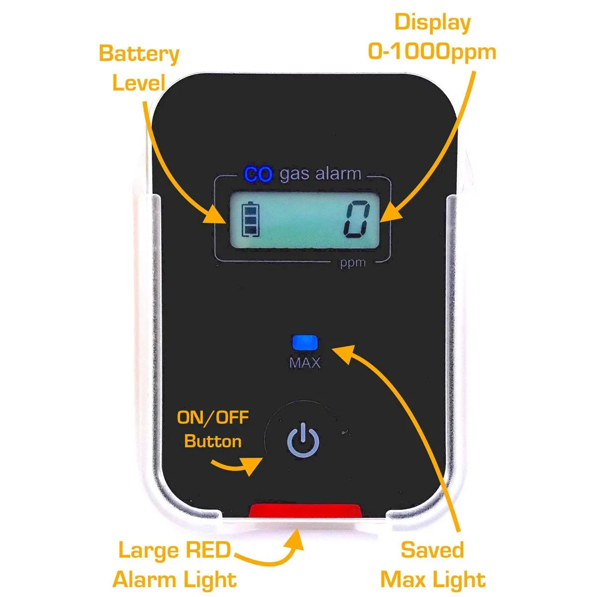 Alarms at >9ppm @ 60 secs, compared to home CO detectors that only alarm >70ppm @ 60-240 minutes. Bright RED LED and buzzer alarms.