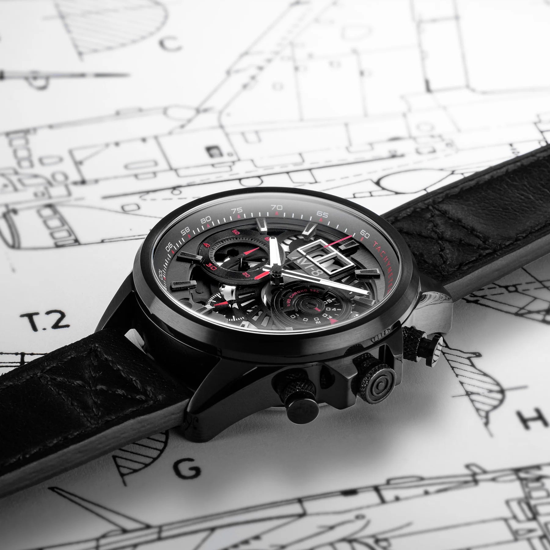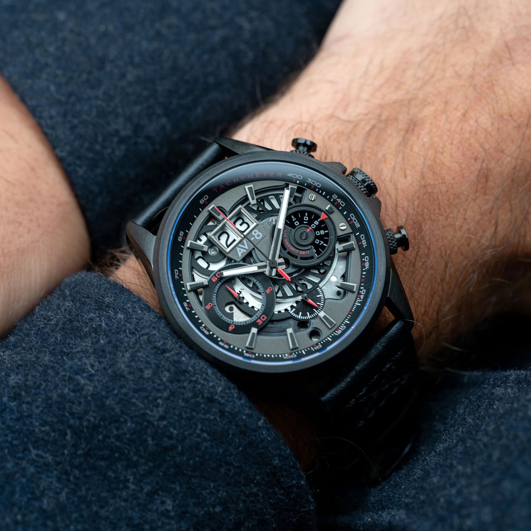 The Hawker Harrier “Jump Jet” found service across several air and naval air forces during the latter half of the 20th Century. It represented a breakthrough in aviation design and went on to serve many missions with distinction. To pay tribute to the variants of this famed jet, AVI-8 introduced the latest version of its Harrier chronograph family inspired by the planes that flew for the Spanish Navy, nicknamed the “Matador”. In full timing operation, the Matador comes alive with a whirring of hands and wheels that create a dynamic experience not unlike that of a Harrier in full flight.