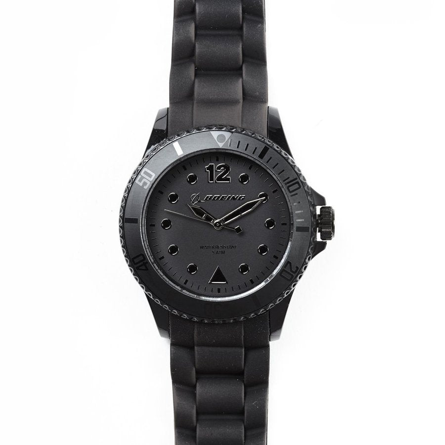 This watch offers bold styling and comfortable wear. It has a three-hand movement set in a 40-mm polycarbonate case with turning bezel. The soft 18-mm black silicone strap is adjustable, and the easy-to-read dial is embellished with a raised silvertone Boeing logo for a personal touch. Water-resistant to 5 atm.