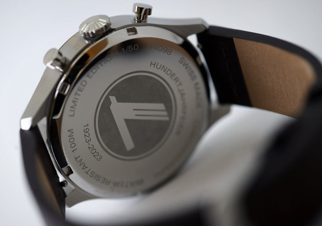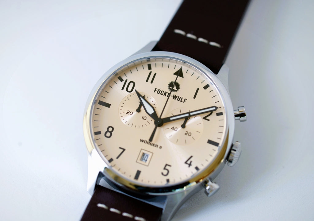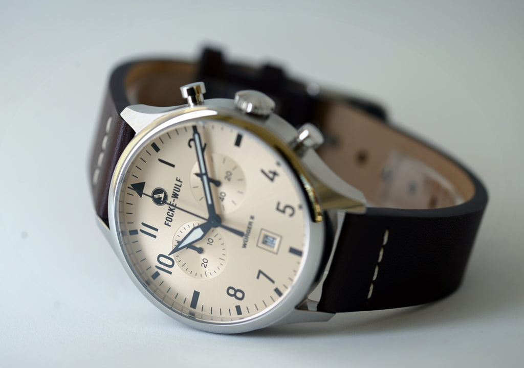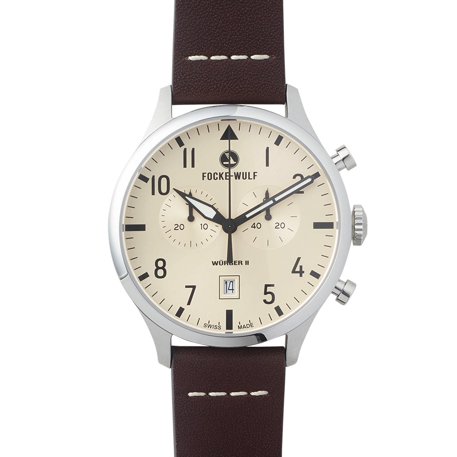 The Focke Wulf FW190 watch has a 42.5mm case with tapering brushed lugs and a chrome bezel. It is made from high grade stainless steel and is beautifully weighted, but not heavy or cumbersome. The Focke Wulf watch has a classic crown (controlling time and date), and two capped pushers (controlling the chronograph). The watch face is protected by K1 mineral crystal with sapphire coating for added strength, clarity and durability. The polished rear case plate is engraved with the Focke Wulf logo. The brushed buckle is inset with the Focke Wulf name. And all of this adds up to create a stunning chronograph!