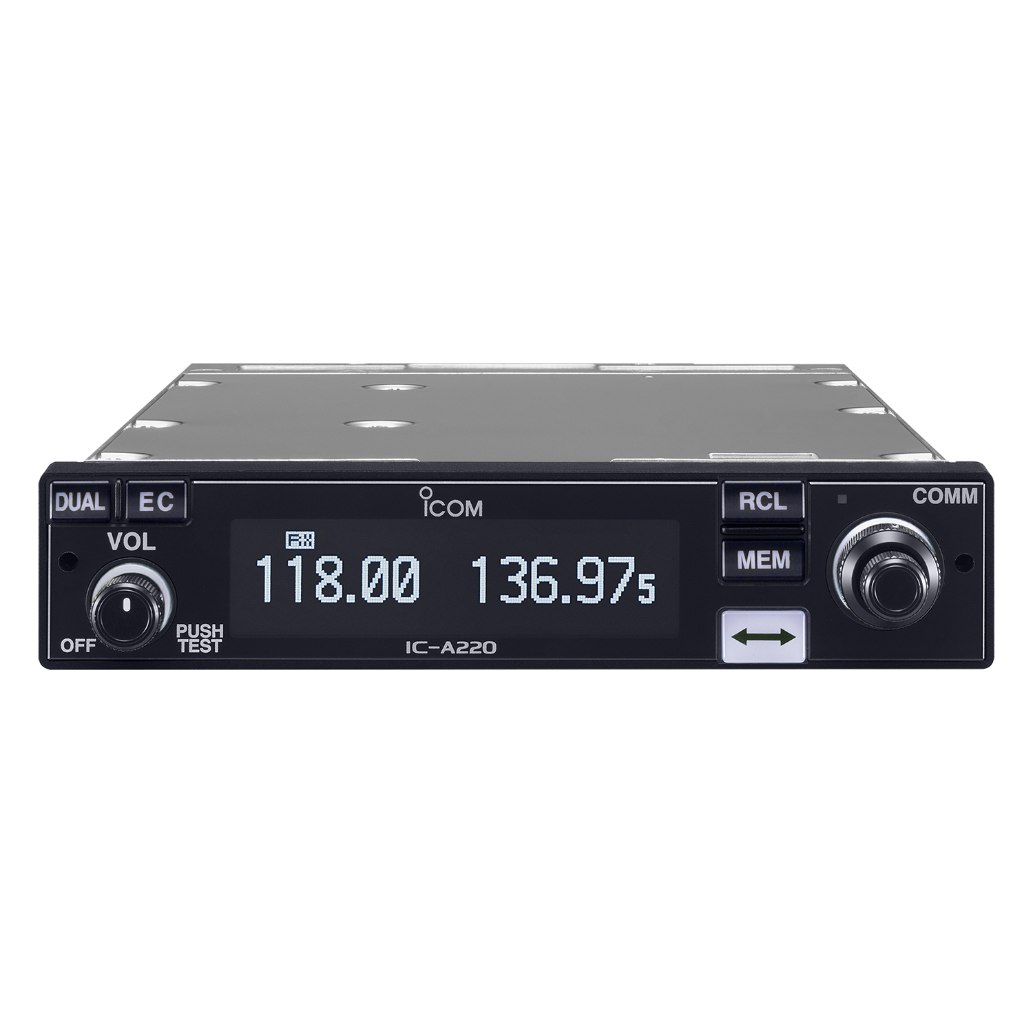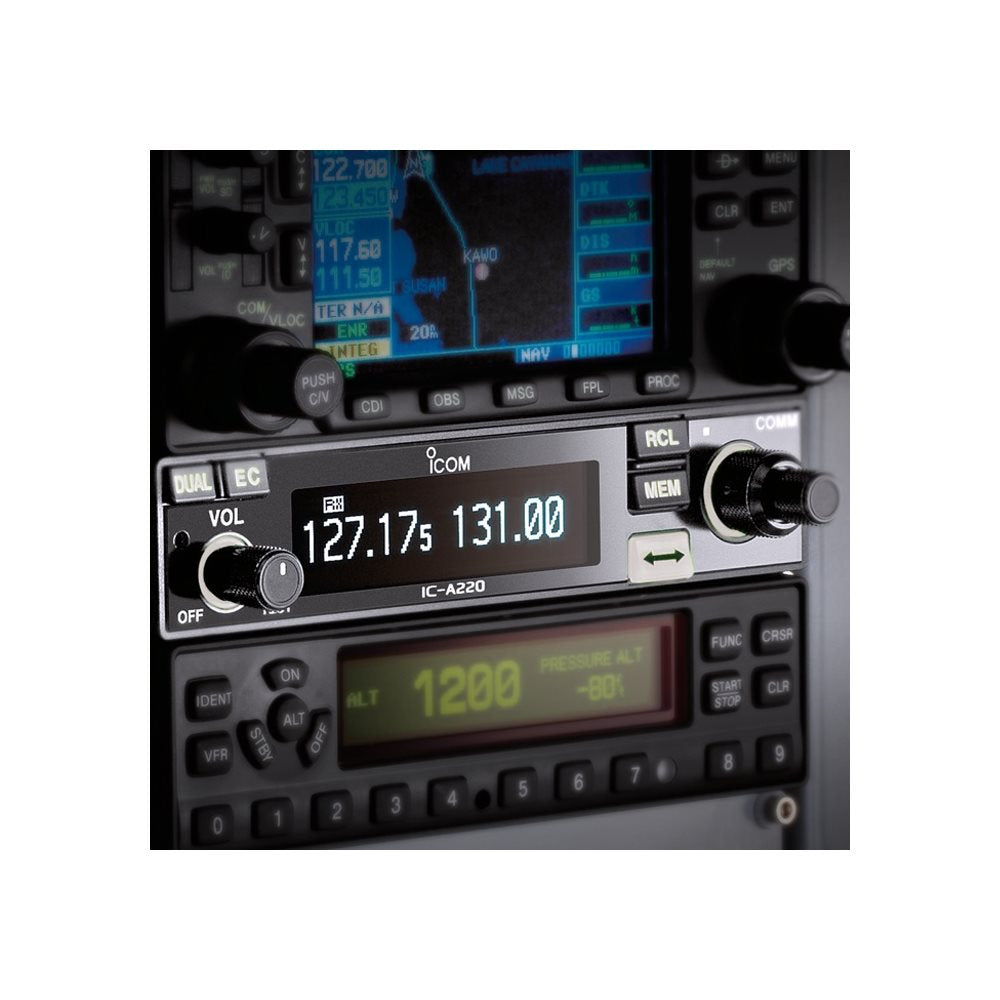 The IC-A220 has a built-in voice activated intercom function allowing the pilot to talk with the copilot via the headset. The IC-A220 has adjustable audio level and squelch control functions.
