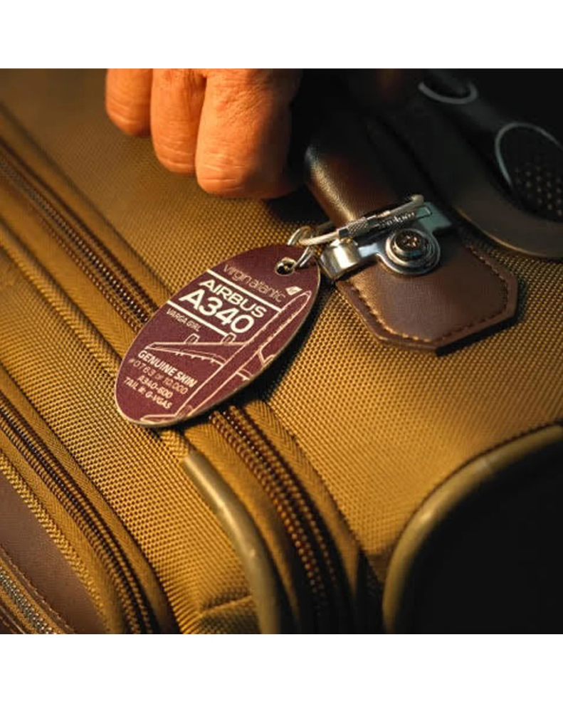 Our PlaneTag from Virgin Atlantic Airways is cut from the Airbus A340-642 registered as G-VGAS. Her first flight from Airbus in Toulouse, France was on March 16, 2005 and she proudly served the Virgin fleet of aircraft until May, 2017. She was named ‘Varga Girl’ after Alberto Vargas, the Peruvian artist who inspired the flying lady logo for Virgin. During her service, she flew 6,522 flights and a total of 56,589 hours.
