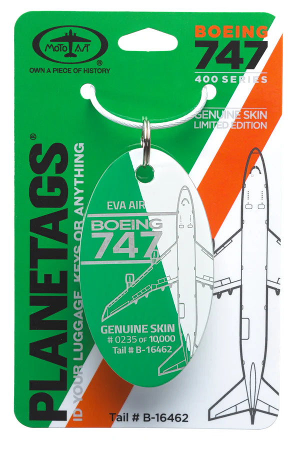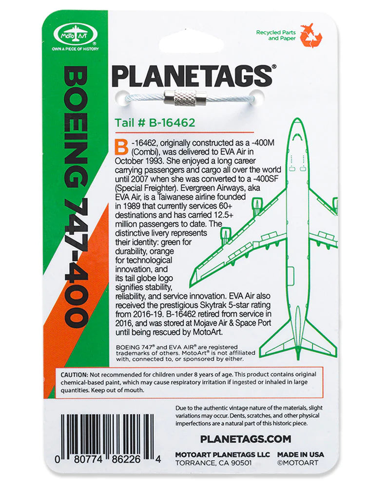 PlaneTags are made from actual retired aircraft fuselage, not merely stamped metal. Each PlaneTag bears the color, thickness, and wear and tear from the portion of the fuselage from which it was cut. Therefore, it is rare to create two identical PlaneTags. These variations and imperfections are not product flaws.