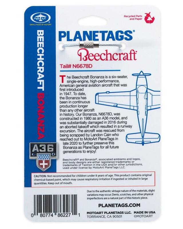 Beechcraft® and Bonanza®, associated emblems and logos, and body designs are either registered trademarks or trademarks of Textron in the USA and/or other jurisdictions, used under license by MotoArt PlaneTags LLC.