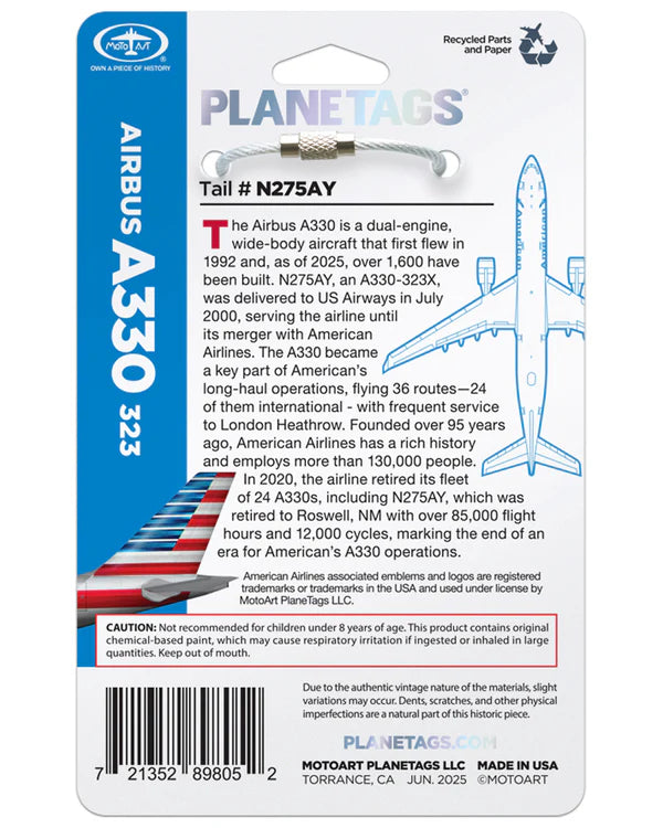 Now, MotoArt proudly presents PlaneTags made from the authentic skin of N275AY. These collectible tags are a must-have for frequent flyers, Airbus fans, and collectors who appreciate aircraft that helped shape modern air travel.