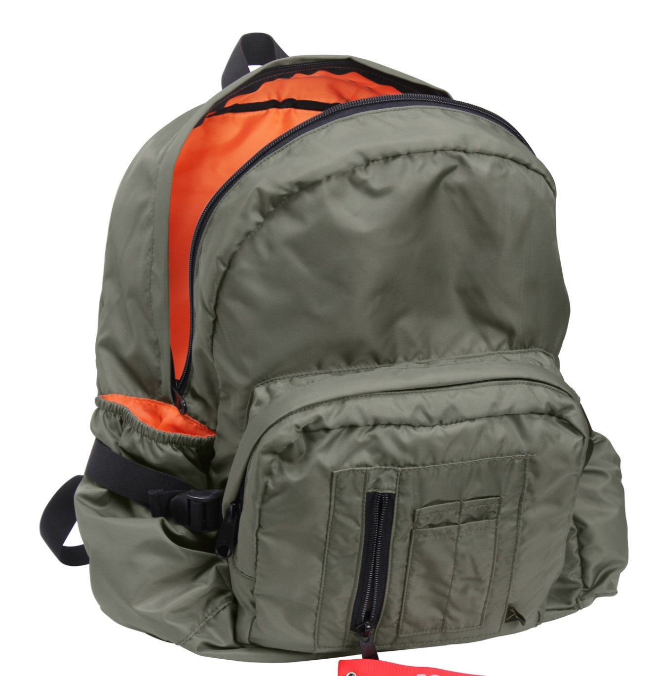 Rothco's MA-1 Bomber Backpack is inspired by our classic Flight Jacket. With a large main compartment featuring the iconic orange lining on the side, the backpack fully represents the MA-1. It has an outer front compartment, an MA-1 flight jacket style zippered pocket complete with red Rothco pull tab and 2 pen slots, as well as 2 side bottle holders. The bomber jacket bag measures 15" x 13.5" x 7".
