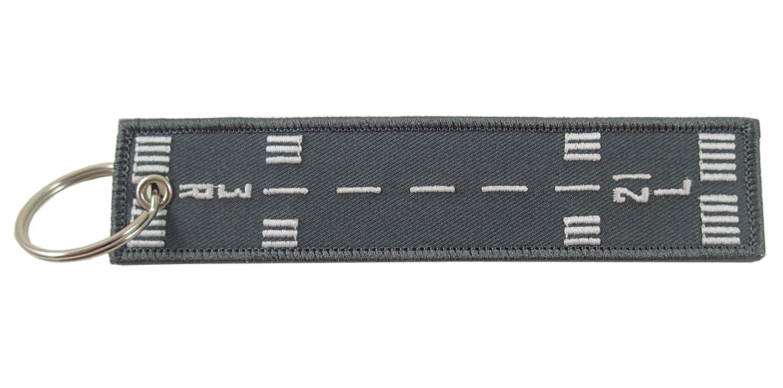 This key chain features an embroidered runway design on both sides of a stiff, durable, merrow-bordered material and comes with a large steel ring to easily hold all types of keys.